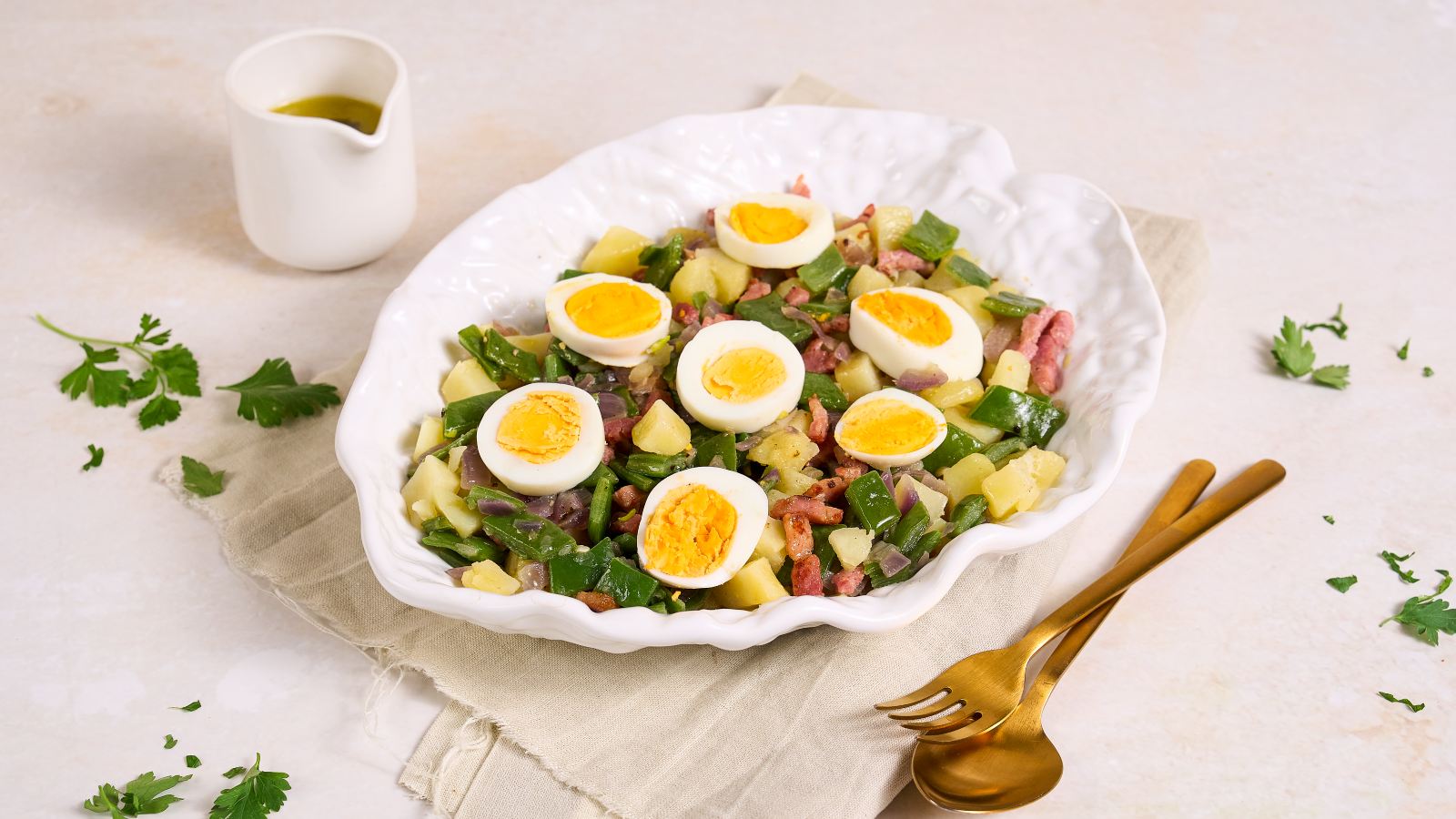 8. Montagem da salada: Numa tigela grande, misture as batatas, os feijões verdes, o bacon e a cebola, e os ovos cortados em rodelas. Regue a salada com o caldo reduzido dos feijões, para intensificar os sabores. Acrescente o molho formado pela gordura do bacon deglaçada com vinagre, misturando bem para distribuir o sabor.