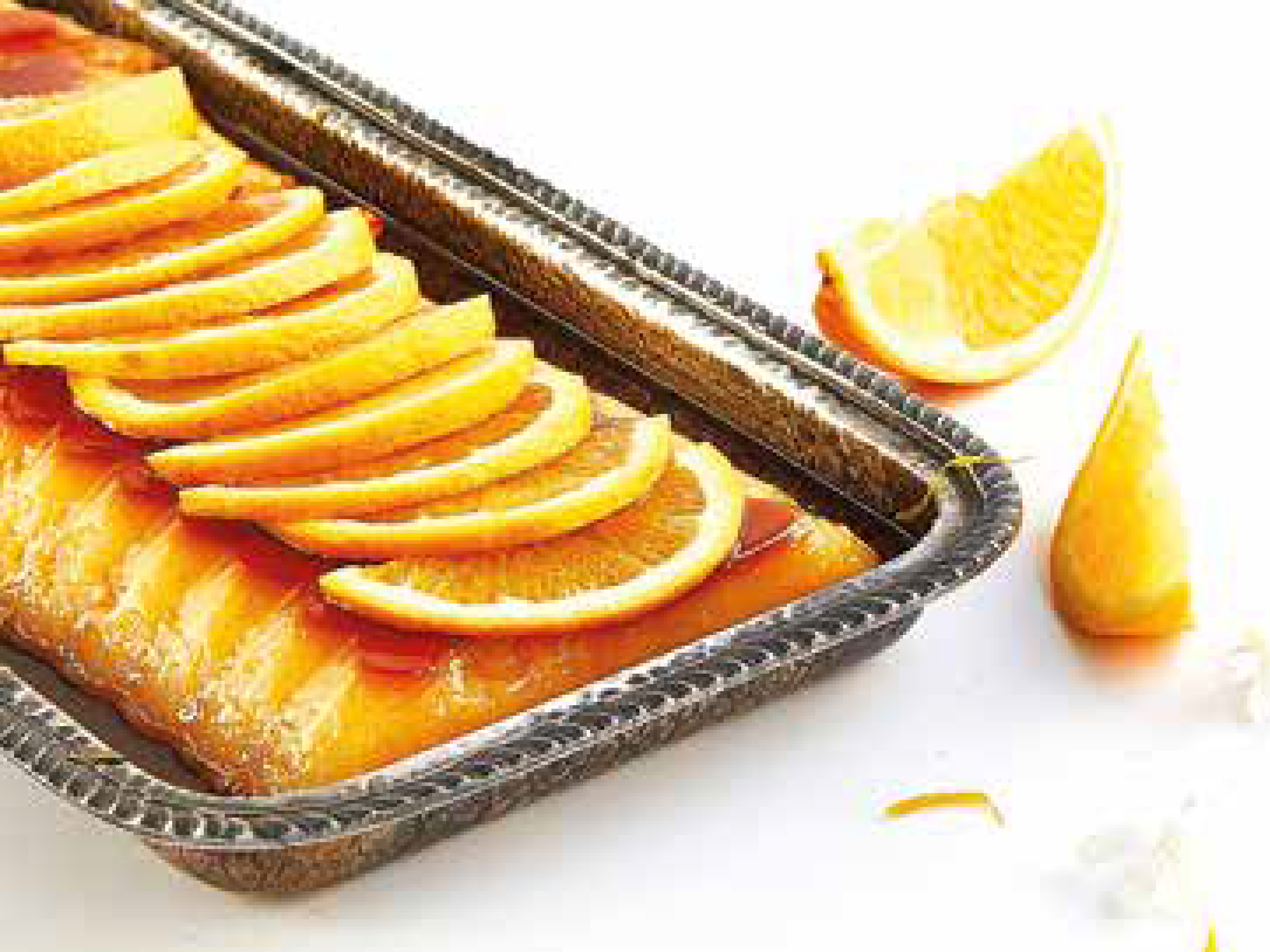 Servir o bolo de laranja e decorar com raspa de laranja.