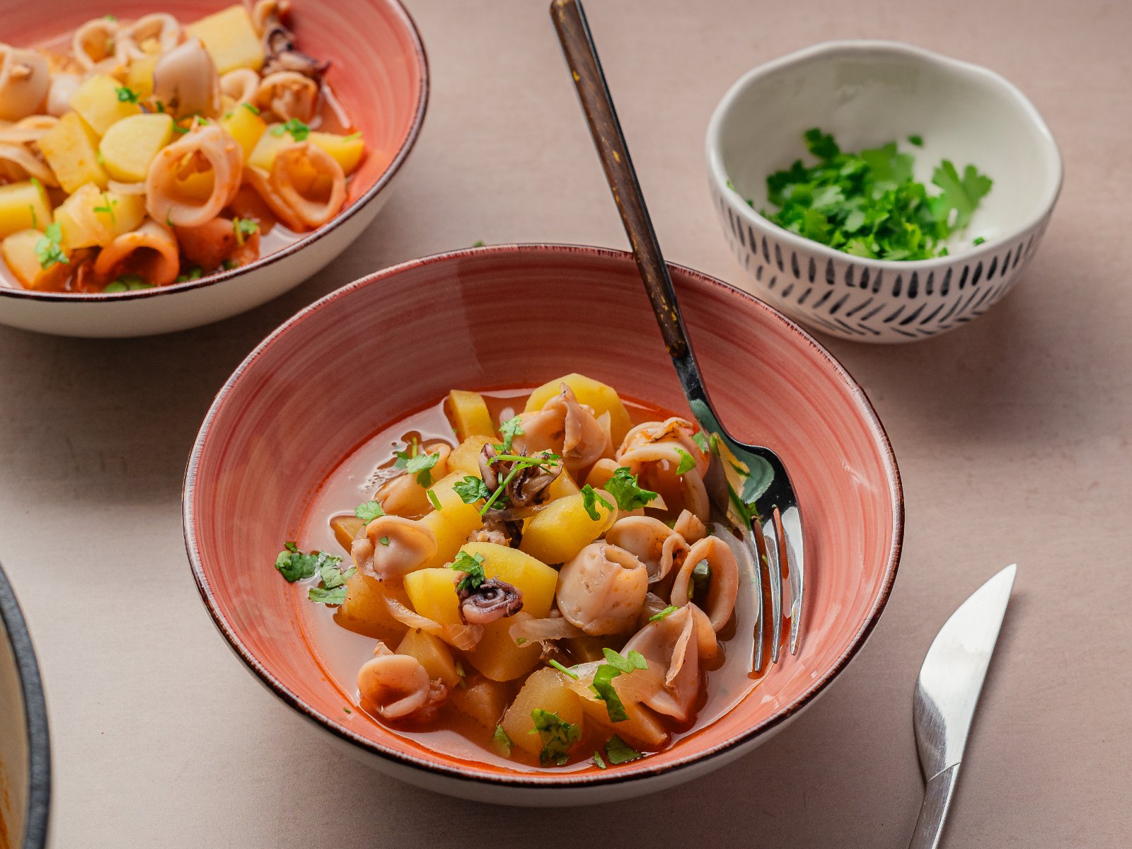 Sirva o puré de batata e por cima disponha as lulas estufadas regando com molho e decore com salsa picada a gosto.