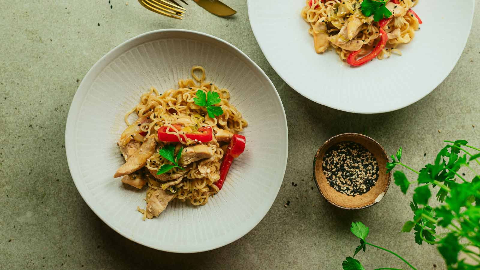 Retire do lume, sirva a massa chinesa com frango e legumes. Decore com salsa fresca e com sementes de sésamo.
