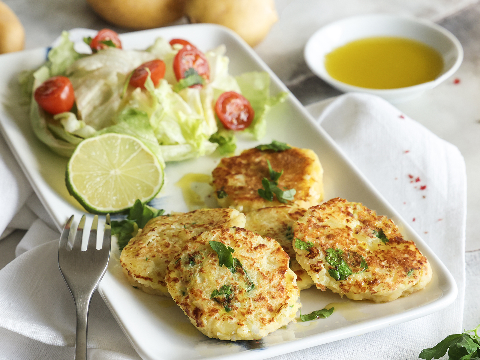 Tempere os filetes de peixe com azeite, sumo de limão, sal e pimenta, pimentão doce e polvilhe salsa picada.