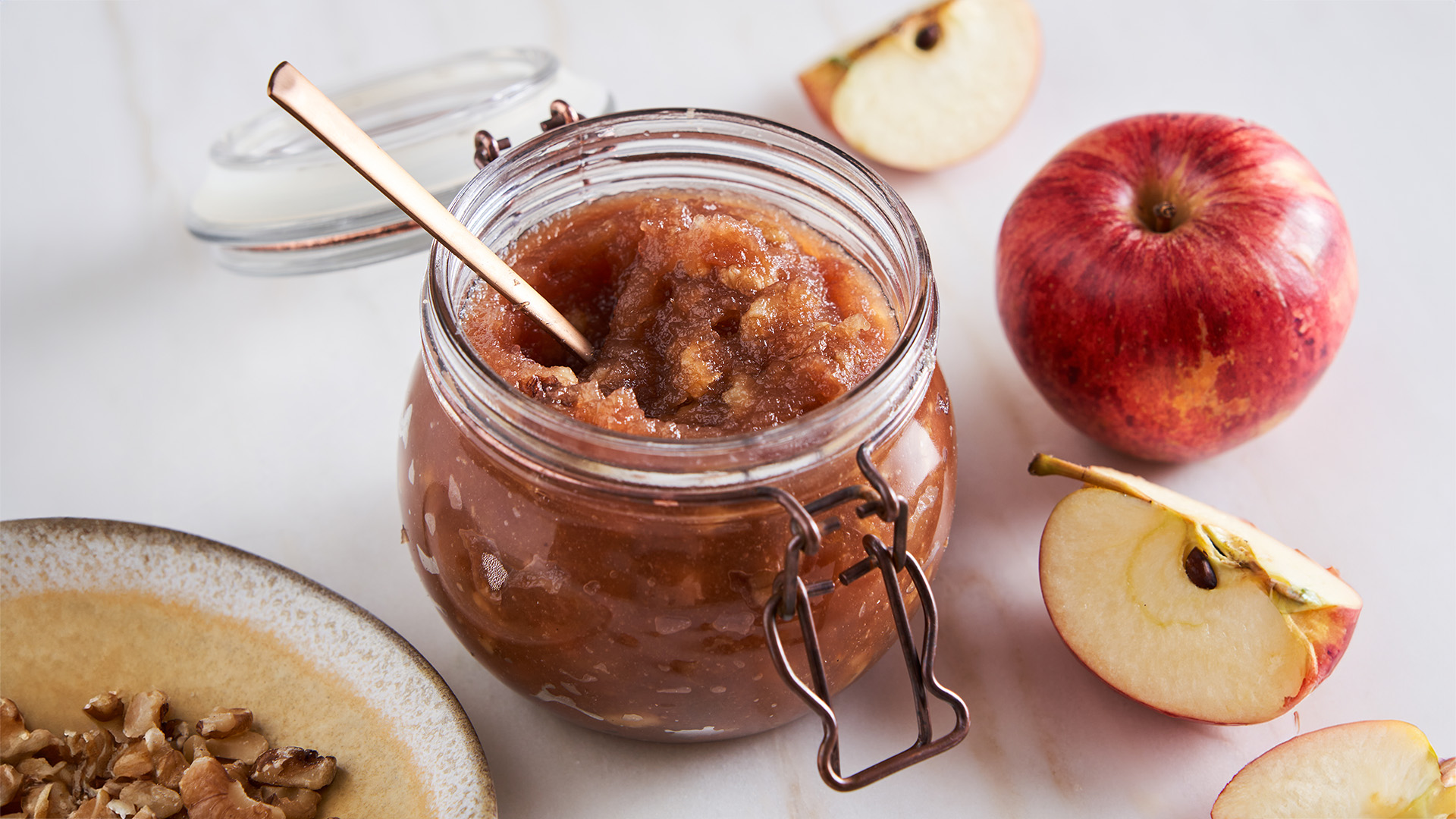 Derreta o chocolate em banho-maria. Pode aproveitar a água da cozedura das maçãs.