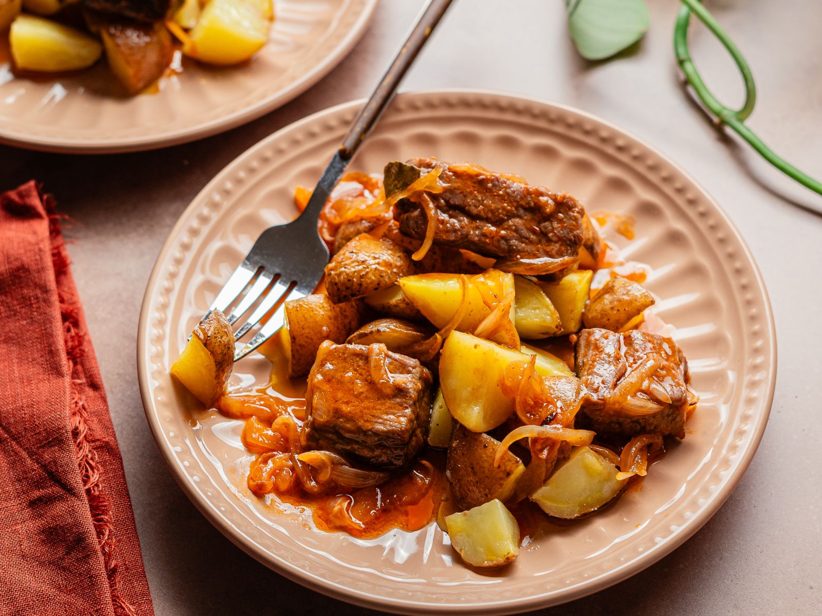 Colocar numa travessa de ir ao forno a carne vitelão em cubos, temperar com sal e pimenta, juntar a cebola laminada e a mistura de alho e pimenta doce. Envolver bem a carne nesta mistura com a ajuda das mãos. Levar ao forno a 200ºC por 50 a 60 minutos regando de vez em quando com o molho do próprio tempero.
