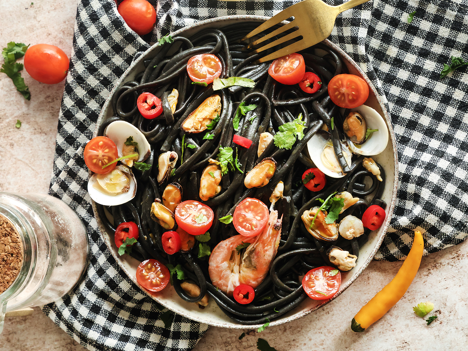 Adicione as cabeças e as cascas dos camarões, o tomate pelado em pedaços pequenos, o amido de milho, o creme de coco e o vinho e programe 10 minutos na mesma temperatura e velocidade. Coloque o cesto sobre a tampa, em vez do copo de medição, para ajudar a evaporar o líquido e evitar salpicos.