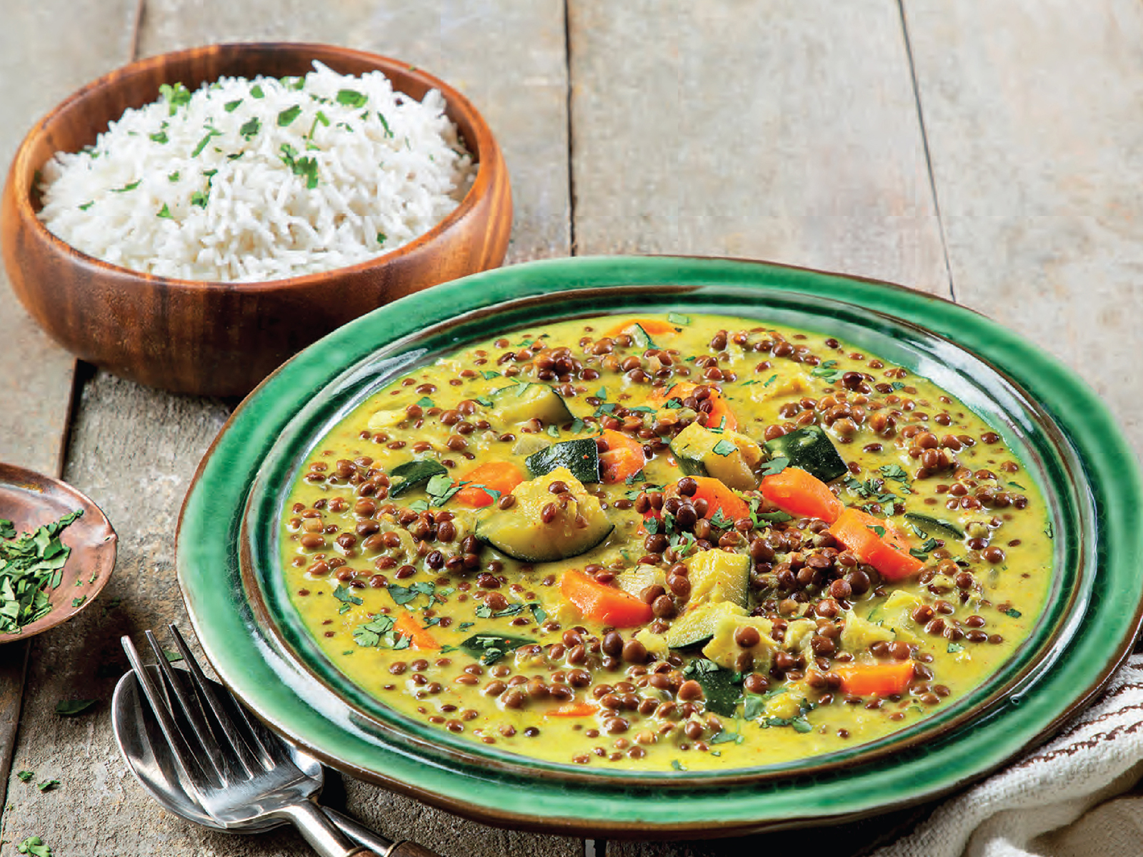 Acrescente as lentilhas escorridas, e um pouco do líquido e programe 7 minutos a 100ºC, com a Rotação Inversa na velocidade 1. Verifique se os legumes e as lentilhas estão cozinhados ao seu gosto e, se necessário, regule mais uns minutos na mesma velocidade e temperatura. Sirva salpicado com coentros picados e acompanhe com arroz basmati.