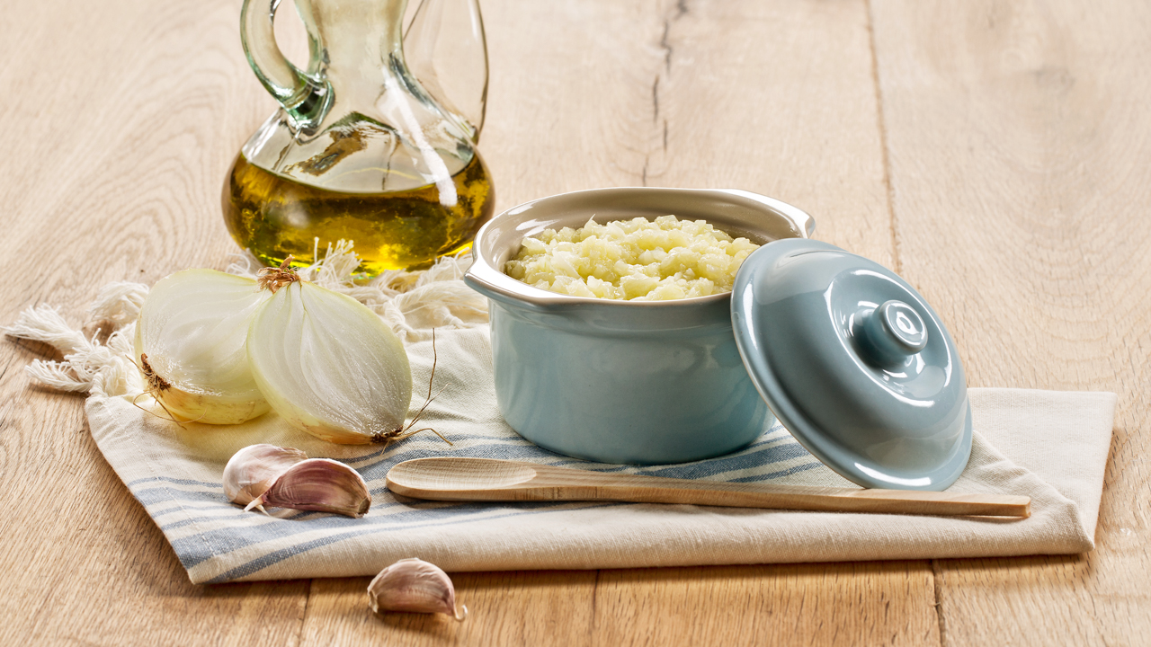 Refogado (com cebola, alho e azeite; ou cebola, alho, tomate e azeite; ou cebola, alho, cenoura e azeite) |