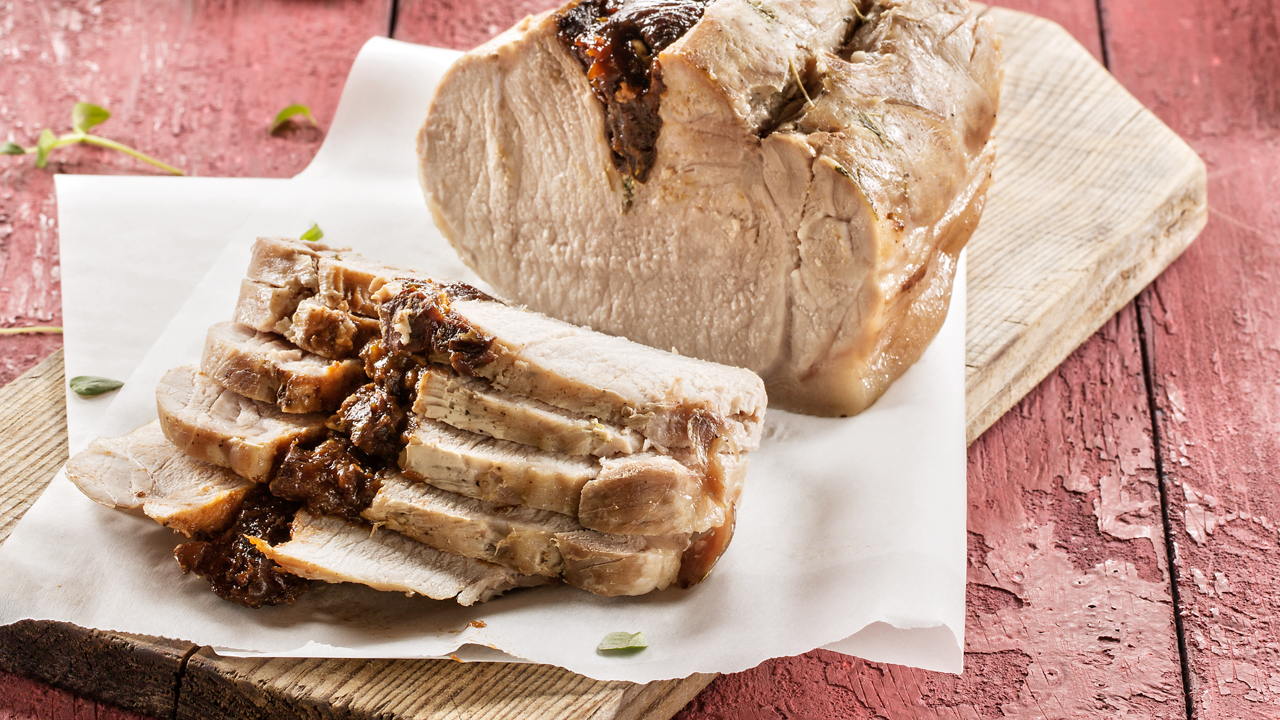 Acrescente o tomate em cubos, a polpa de tomate, o pimentão‑doce, o vinho tinto, a água e o caldo de carne. Retire a maior parte do sal do entrecosto. Introduza‑o na panela. Monte a bandeja de vapor e programe 35 minutos, na Rotação Inversa, na Função Vapor com a velocidade 1.