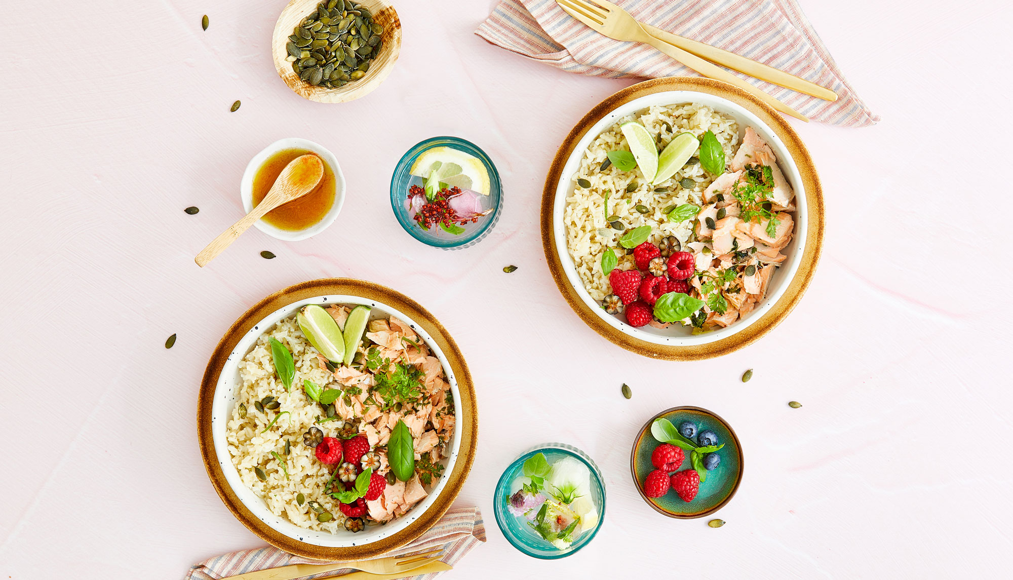 Sirva o arroz com o salmão em lascas. Decore com as framboesas, os mirtilos, o manjericão e as raspas de lima e sirva com o molho.